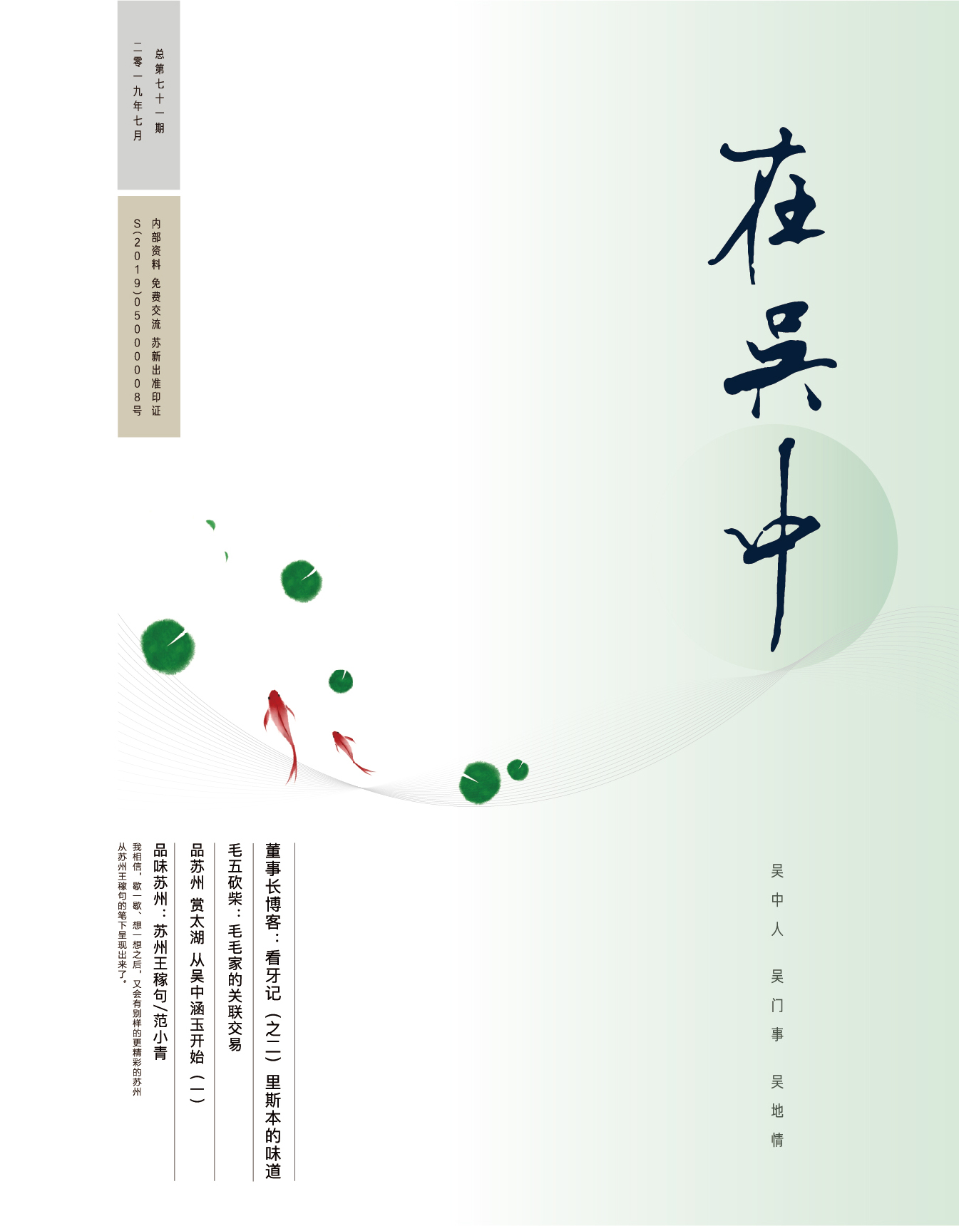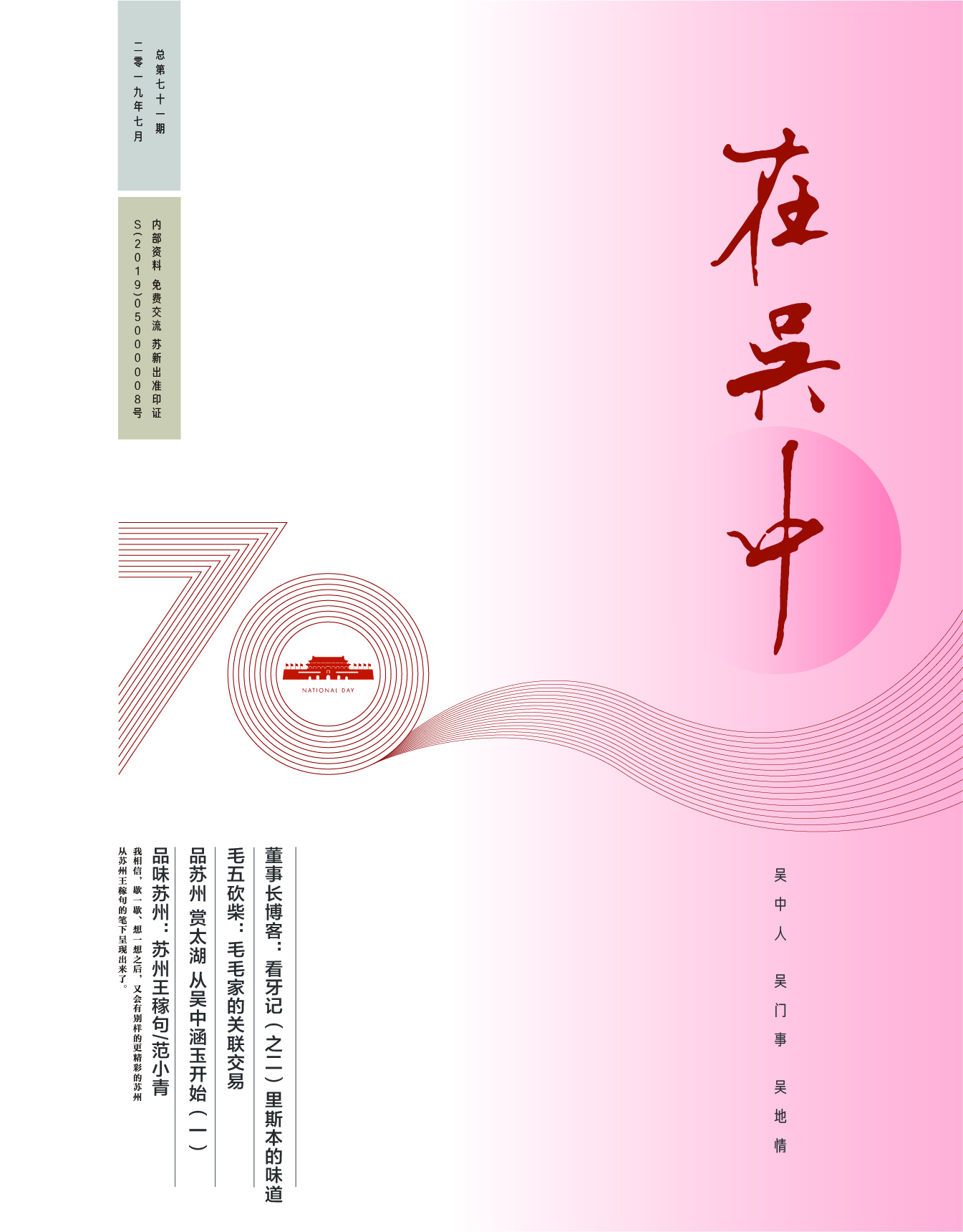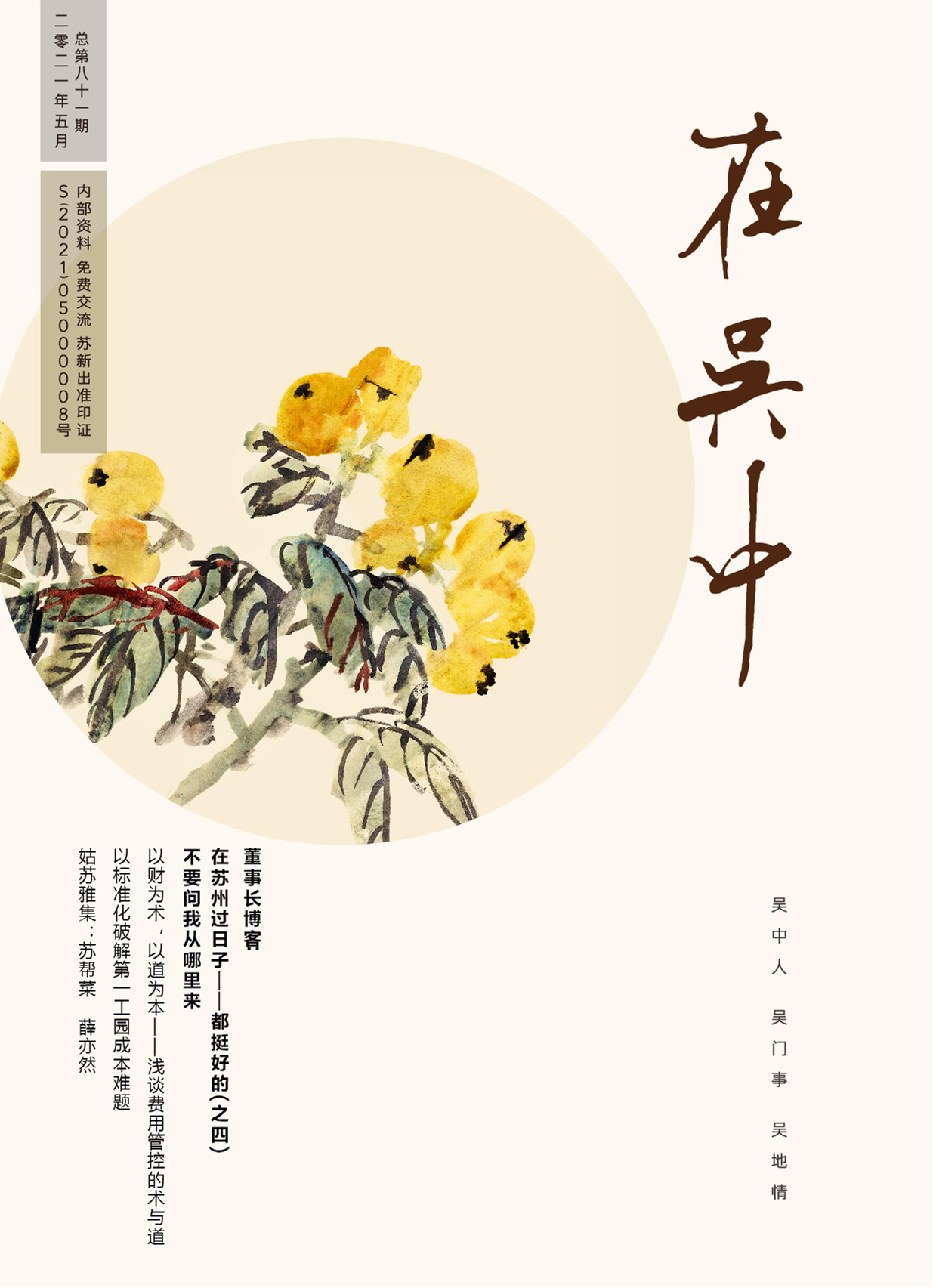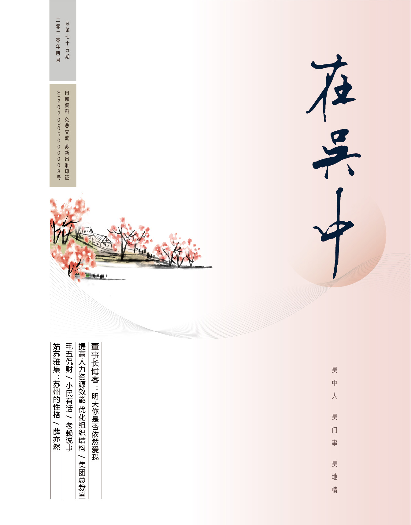 《在吳中》創(chuàng)刊于2005年,蘇州市十佳內(nèi)刊。以述吳中人、記吳中事、傳吳中情為宗旨,堅(jiān)持記錄吳中集團(tuán)的發(fā)展,為品牌建設(shè)發(fā)展助力?!对趨侵小穯纹谟∷?500冊(cè),主要用以企業(yè)內(nèi)部交流,其意在傳達(dá)的吳中集團(tuán)的力量、文化和精神。每期《在吳中》都記載著吳中人工作、學(xué)習(xí)、生活的實(shí)時(shí)動(dòng)態(tài),所見所聞、所思所想、所作所為,總結(jié)借鑒企業(yè)經(jīng)營管理之道,汲取吳地人文精髓,廣受社會(huì)各界的好評(píng)和認(rèn)可。