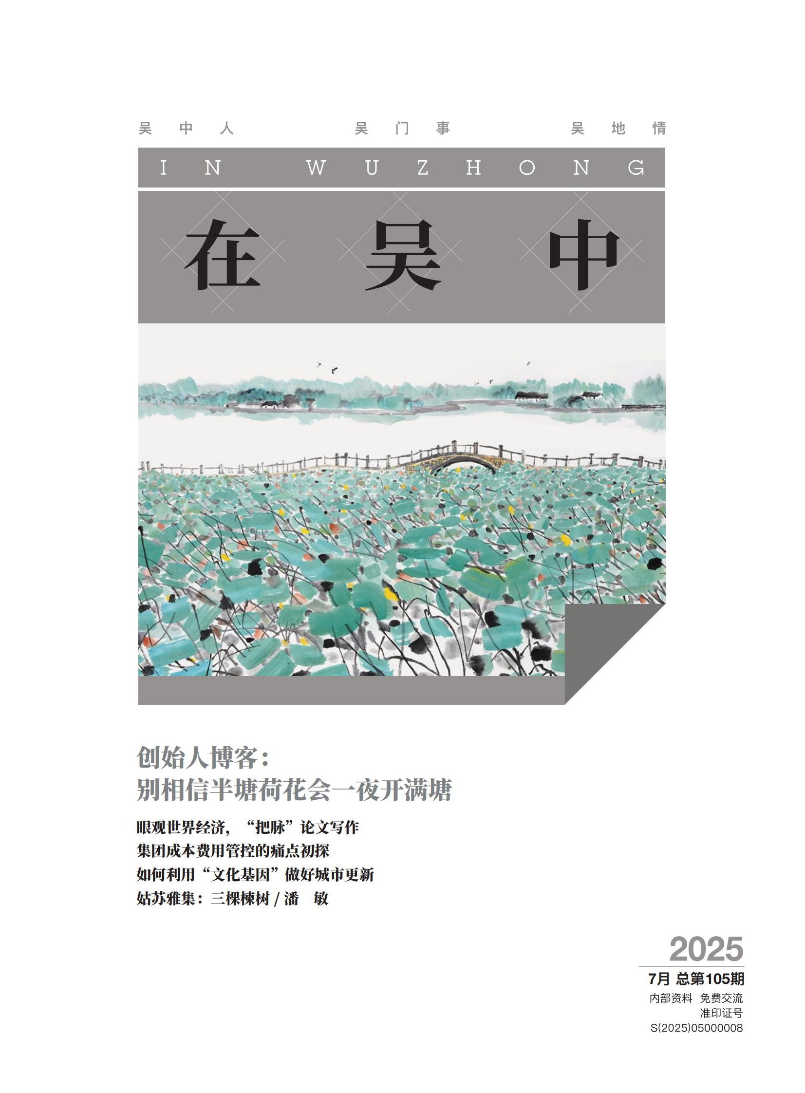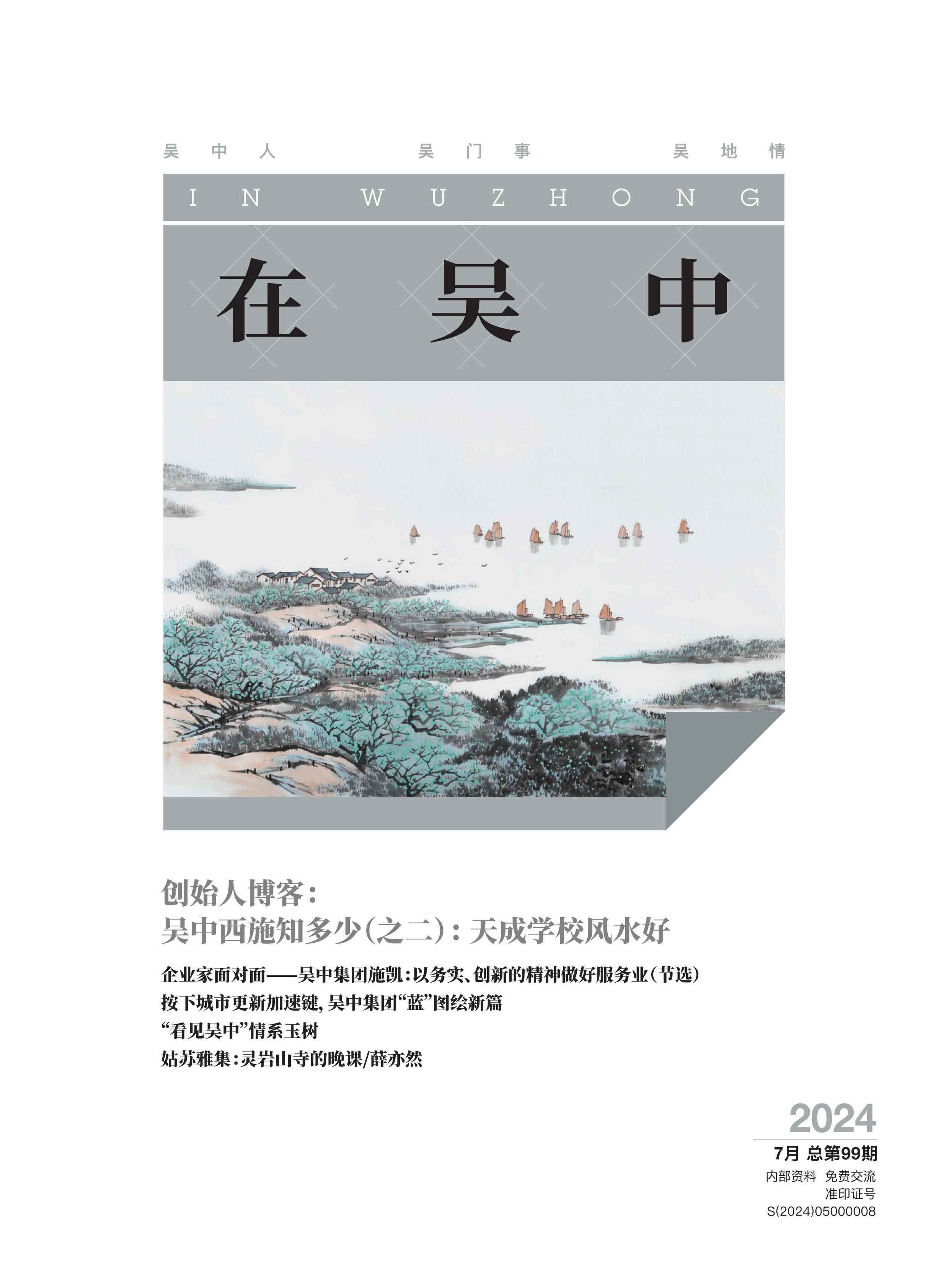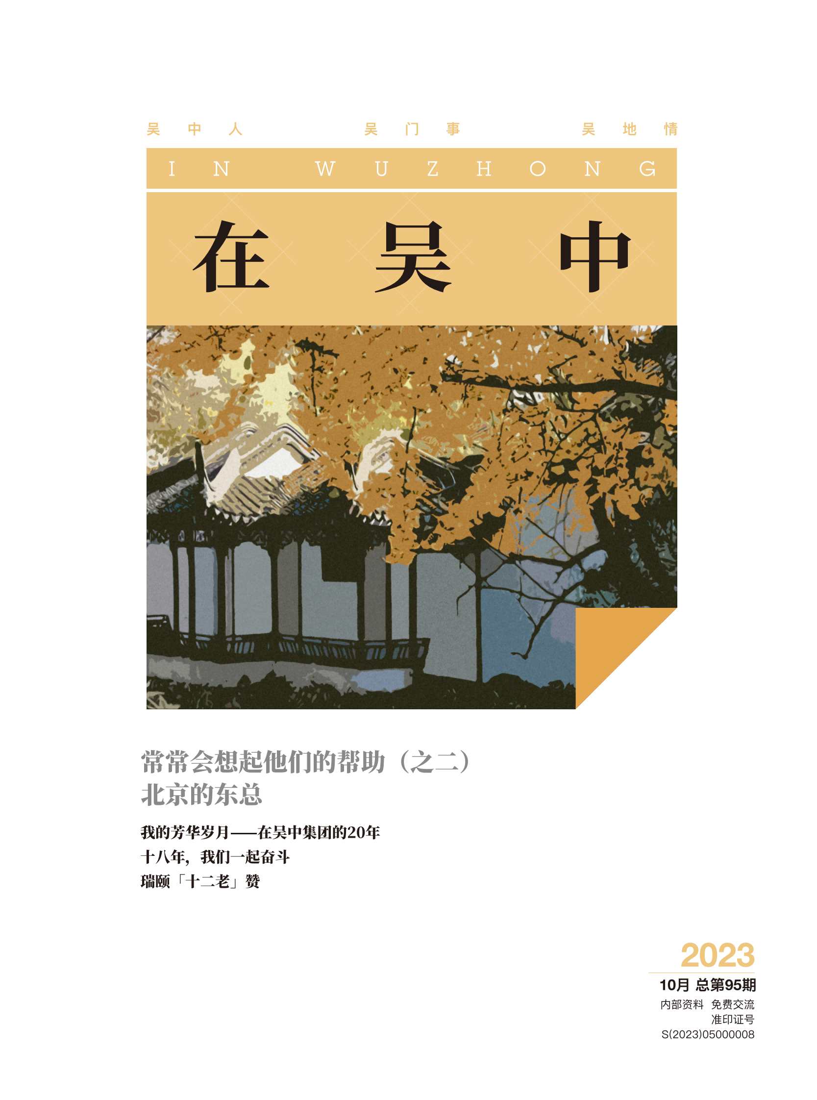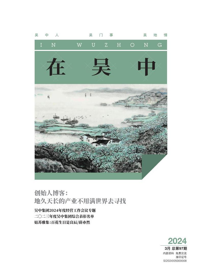 《在吳中》創(chuàng)刊于2005年,蘇州市十佳內(nèi)刊。以述吳中人、記吳中事、傳吳中情為宗旨,堅持記錄吳中集團的發(fā)展,為品牌建設(shè)發(fā)展助力?!对趨侵小穯纹谟∷?500冊,主要用以企業(yè)內(nèi)部交流,其意在傳達(dá)的吳中集團的力量、文化和精神。每期《在吳中》都記載著吳中人工作、學(xué)習(xí)、生活的實時動態(tài),所見所聞、所思所想、所作所為,總結(jié)借鑒企業(yè)經(jīng)營管理之道,汲取吳地人文精髓,廣受社會各界的好評和認(rèn)可。